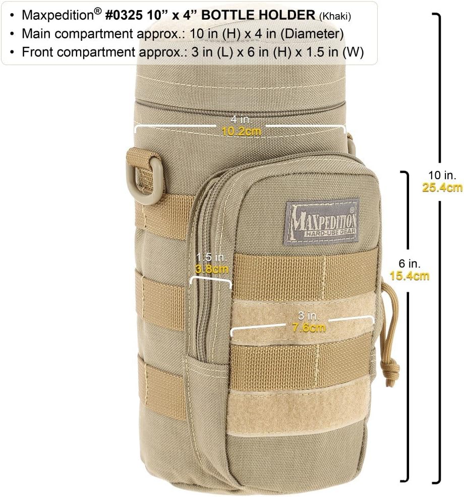The 10″ x 4″ Bottle Holder is designed to fit a 32oz / 1L Nalgene bottle (sold separately) or similarly sized containers. We are breaking new ground with innovations in bags, packs, and pouches for an evolving customer base. We are diversifying with a new range of purposeful, rugged knives and tools, as well as a line of morale patches. While already the leader in our market space, Maxpedition is committed to improvement, optimizing ergonomics, creating user-friendly designs, and using only the highest quality materials and world-class craftsmanship. We are here because of our customers; we are always seeking customer feedback, and incorporating their knowledge and experience into our products.